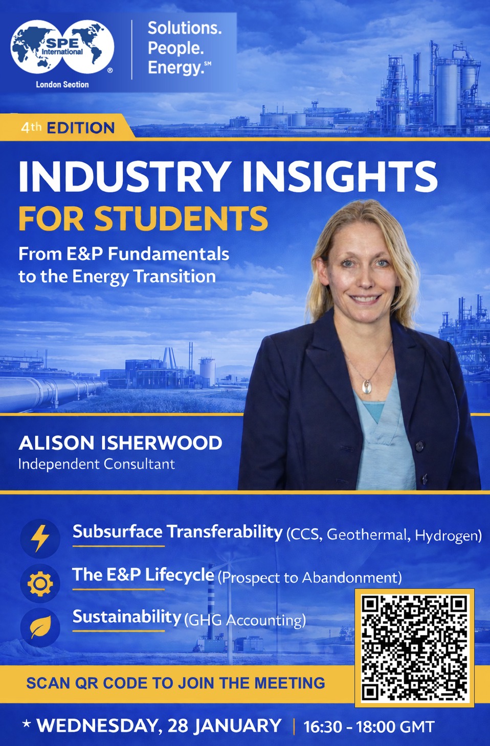 The SPE London Section is excited to invite you to the 4th edition of our student online series. In a world of shifting energy priorities, your technical and management skills are more valuable than ever—but where do they fit? Whether you are studying Petroleum Engineering, Geoscience, Geo-Energy with ML and Data Science, New Energy, or O&G Management, this session is designed to map out your future.